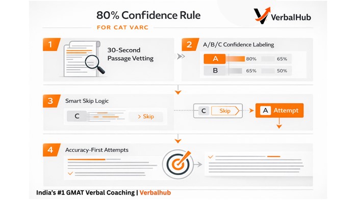 What is the 80% Confidence Rule? The 80% Confidence Rule is VerbalHub's core VARC framework: attempt a question only when you are at least 80% confident in your answer before committing. If you cannot reach that threshold — through passage understanding, option elimination, or logical reasoning — you skip the question. Strategic skipping is not weakness. At the 90+ percentile level, it is the norm.