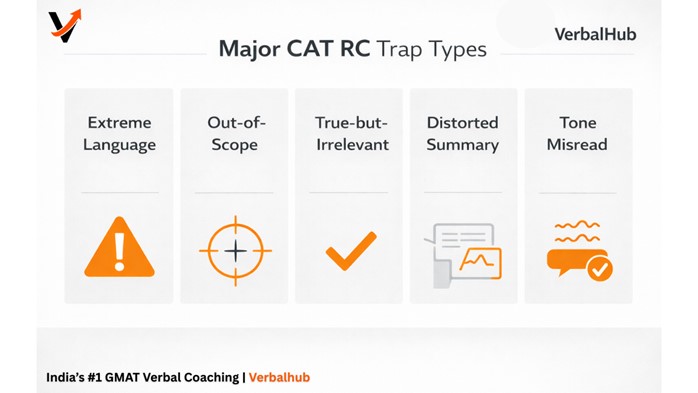 The fourth type is the most dangerous. CAT frequently offers options that take a nuanced, qualified claim from the passage and present it as absolute. The passage might say "in certain industrial contexts, regulation tends to slow innovation." The trap option says "regulation always harms innovation." The difference is obvious in isolation. In a 40-second evaluation window, under exam pressure, it requires genuine discipline to reject the more extreme version.