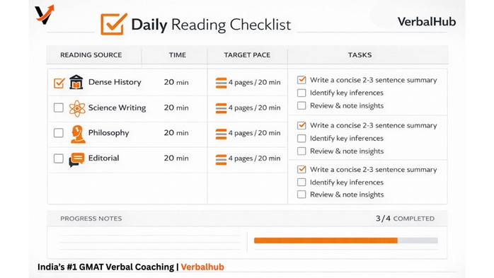 Day 3: Practice 2 RC passages (CAT-level). Apply A/B/C question labeling. Review errors by trap type, not just answer.